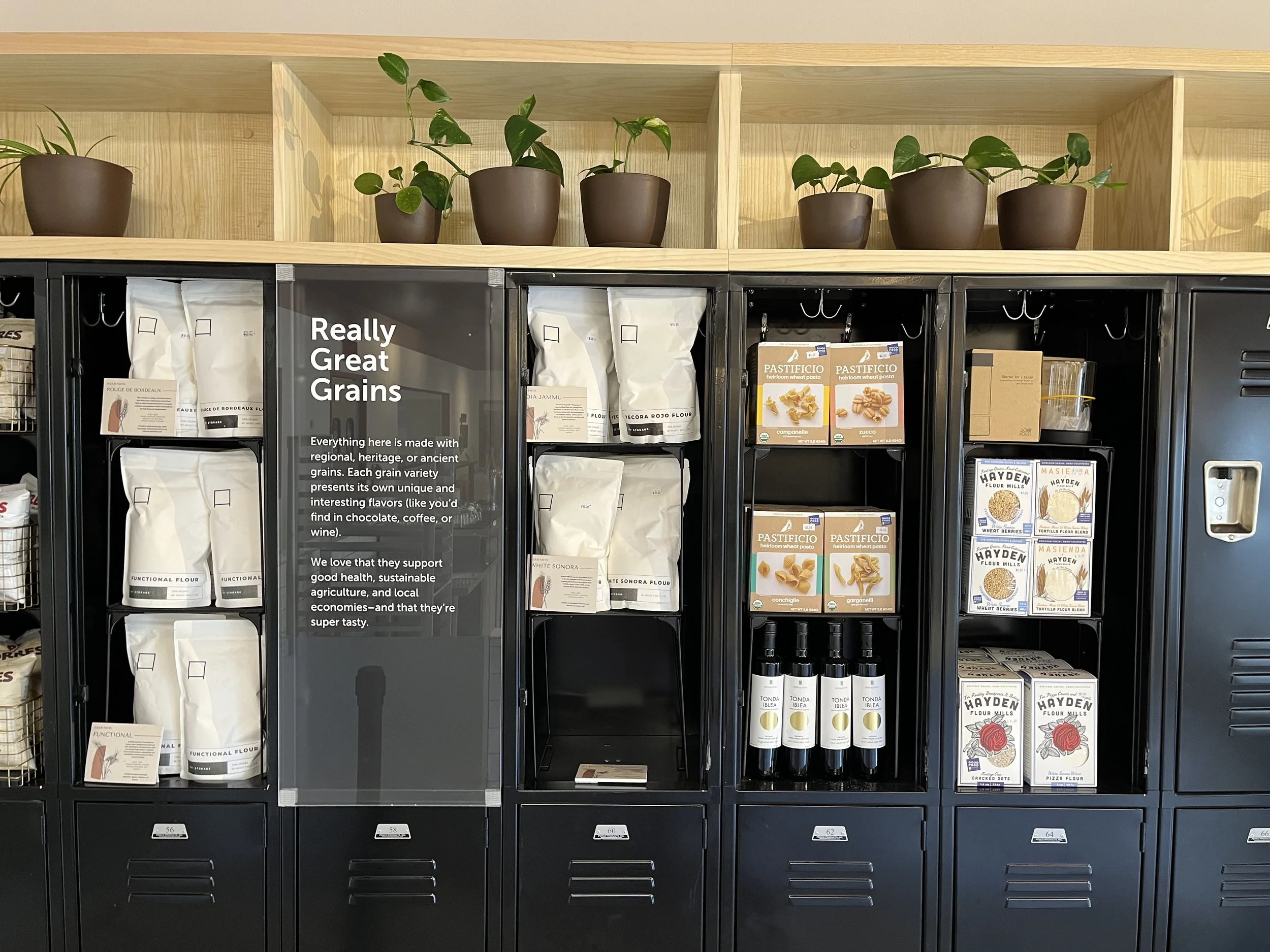 Pantry Goods Lots of locally-milled flour, grain products, and baking tools.